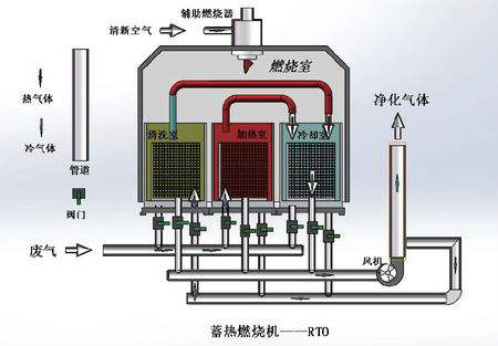 蓄熱式燃燒法(Regenerative Thermal Oxidizers,RTO)是燃燒處理技術(shù)之一,其原理是在一定溫度(一般≥760℃)作用下將污染物完全氧化,去除效率可達(dá)99%以上。此技術(shù)是用多床可蓄熱材質(zhì)的蓄熱室進(jìn)行蓄熱與氧化互相切換的方式,以大幅減少熱量的損耗。RTO的熱回收效率可高達(dá)90%以上,具有凈化效率高、運(yùn)行費(fèi)用低的特點。